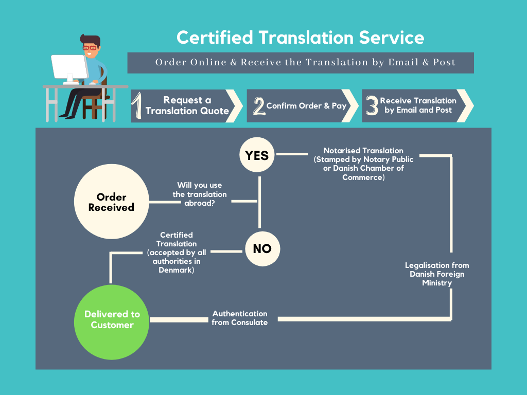 If you intend to submit your certified translation to authorities abroad, we will assist you with the legalisation process. Therefore, our certified translation service includes finalising notarisation, stamp from Danish Chamber of Commerce, authentication and issue of apostille by the Danish Foreign Ministry, and legalisation of the translation from the consulate or embassy of the country in which the translation will be used.